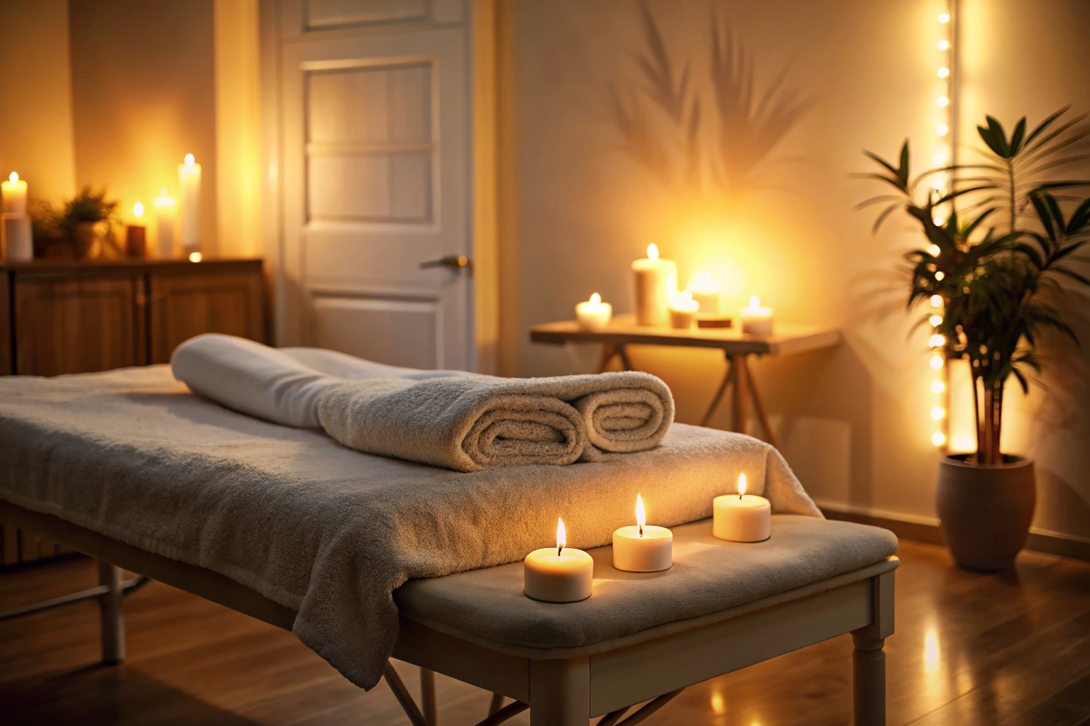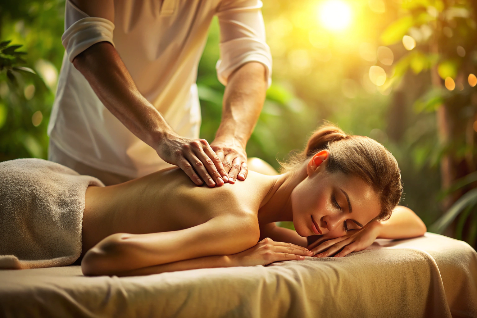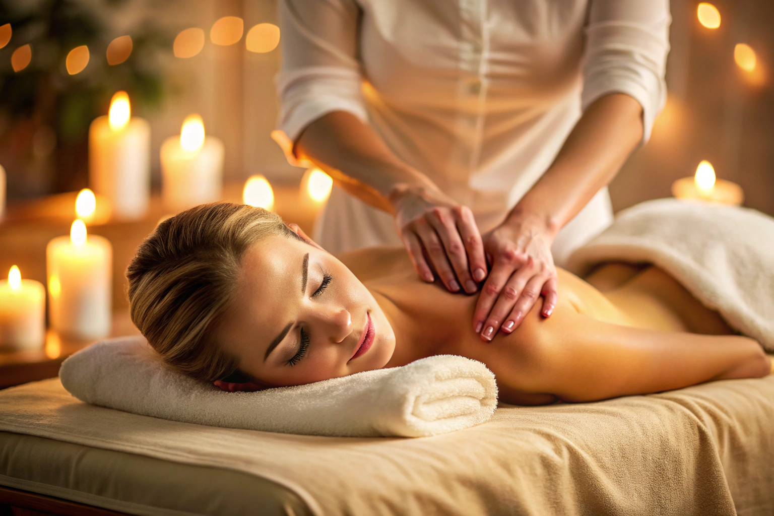 Persona relajada en una sala de masajes con luces tenues, acostada boca abajo en una camilla, músculos sueltos y ambiente sereno
